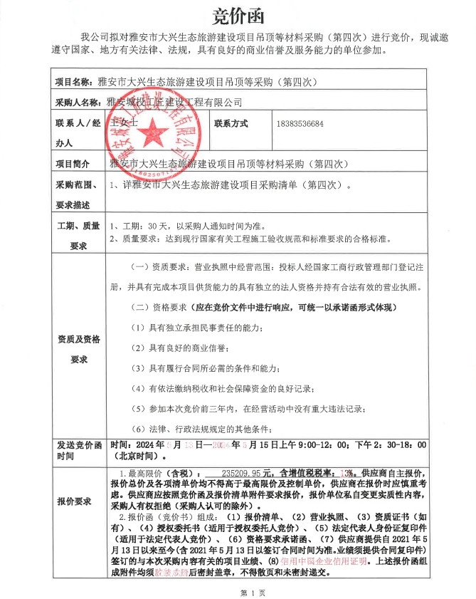 雅安市大興生態(tài)旅游建設(shè)項(xiàng)目吊頂?shù)炔少彛ǖ谒拇危└?jìng)價(jià)公告
