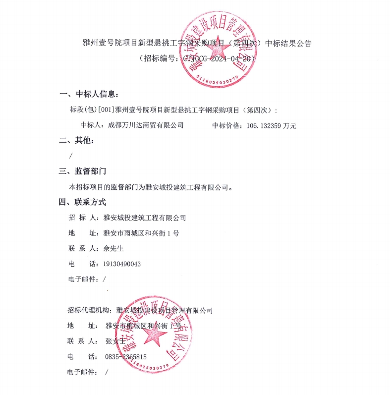 雅州壹號院項(xiàng)目新型懸挑工字鋼采購項(xiàng)目(第四次)中標(biāo)結(jié)果公告