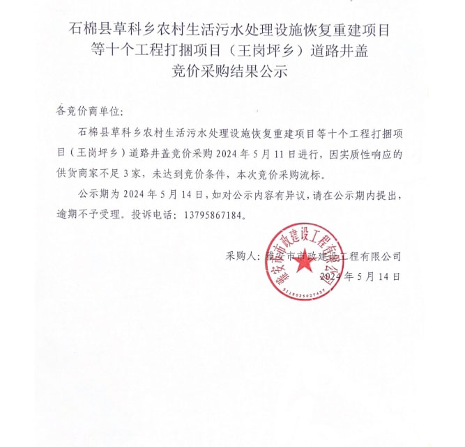 石棉縣草科鄉(xiāng)農(nóng)村生活污水處理設(shè)施恢復(fù)重建項目等十個工程打捆項目(王崗坪鄉(xiāng))道路井蓋競價采購結(jié)果公示