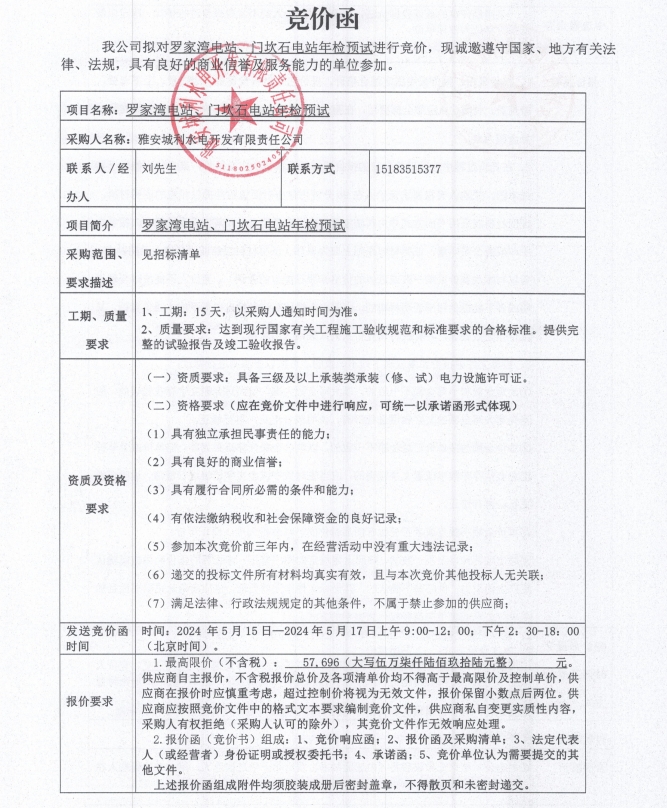 羅家灣電站、門坎石電站年檢預(yù)試競(jìng)價(jià)公告