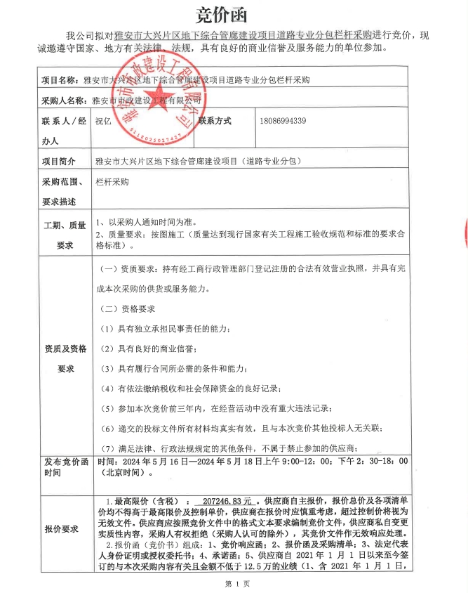 雅安市大興片區(qū)地下綜合管廊建設(shè)項(xiàng)目道路專業(yè)分包欄桿采購競價(jià)公告