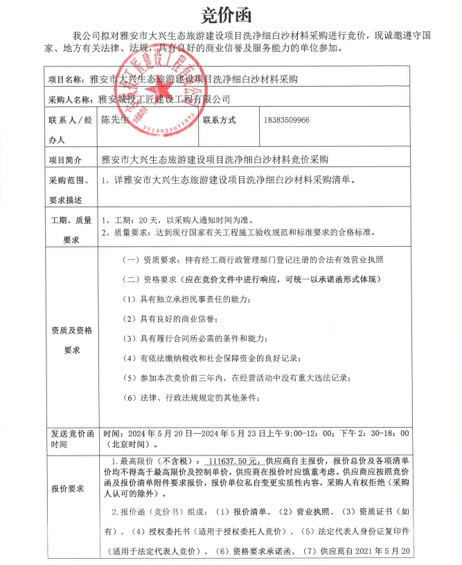 雅安市大興生態(tài)旅游建設(shè)項(xiàng)目洗凈細(xì)白沙材料采購(gòu)競(jìng)價(jià)公告