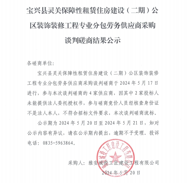 寶興縣靈關(guān)保障性租賃住房建設(shè)(二期)公區(qū)裝飾裝修工程專業(yè)分包勞務(wù)供應(yīng)商采購(gòu)談判磋商結(jié)果公示