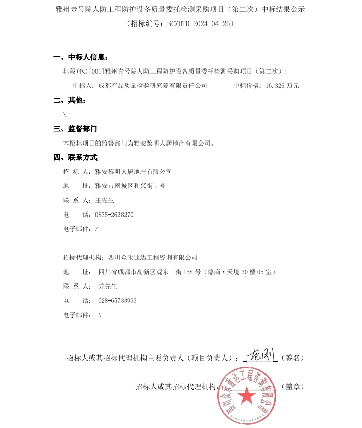 雅州壹號(hào)院人防工程防護(hù)設(shè)備質(zhì)量委托檢測(cè)采購(gòu)項(xiàng)目(第二次)中標(biāo)結(jié)果公示