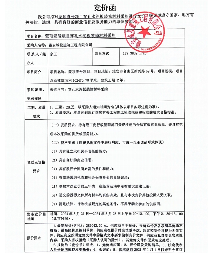蒙頂壹號(hào)項(xiàng)目穿孔水泥板裝修材料采購競(jìng)價(jià)公告