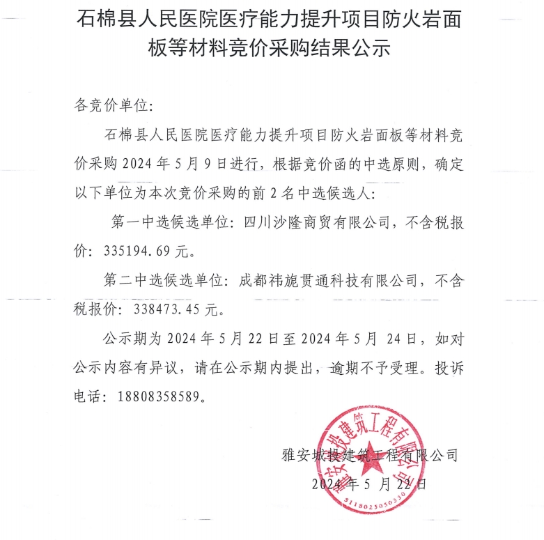 石棉縣人民醫(yī)院醫(yī)療能力提升項(xiàng)目防火巖面板等材料競(jìng)價(jià)采購(gòu)結(jié)果公示