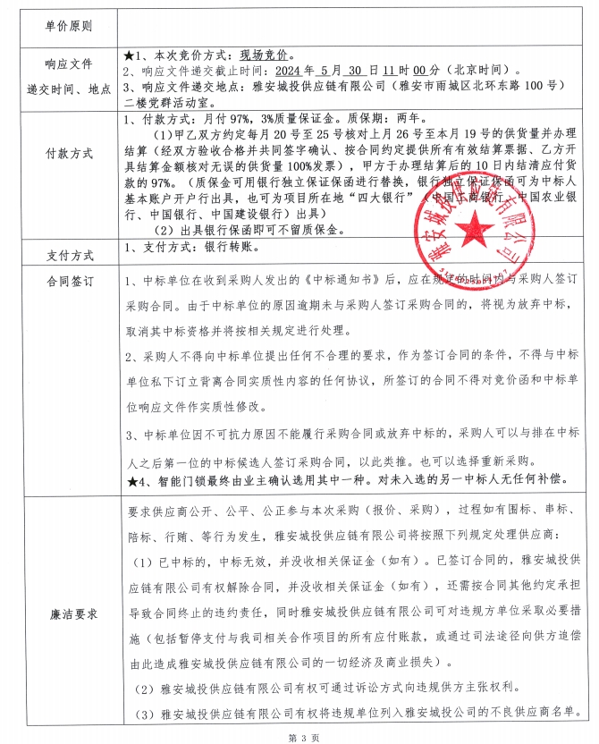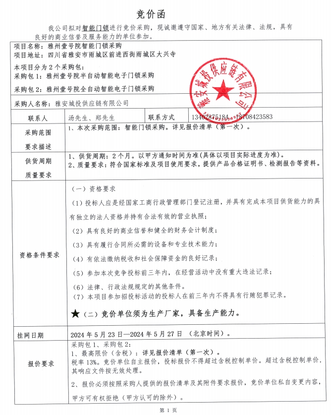 雅州壹號院智能門鎖采購競價公告