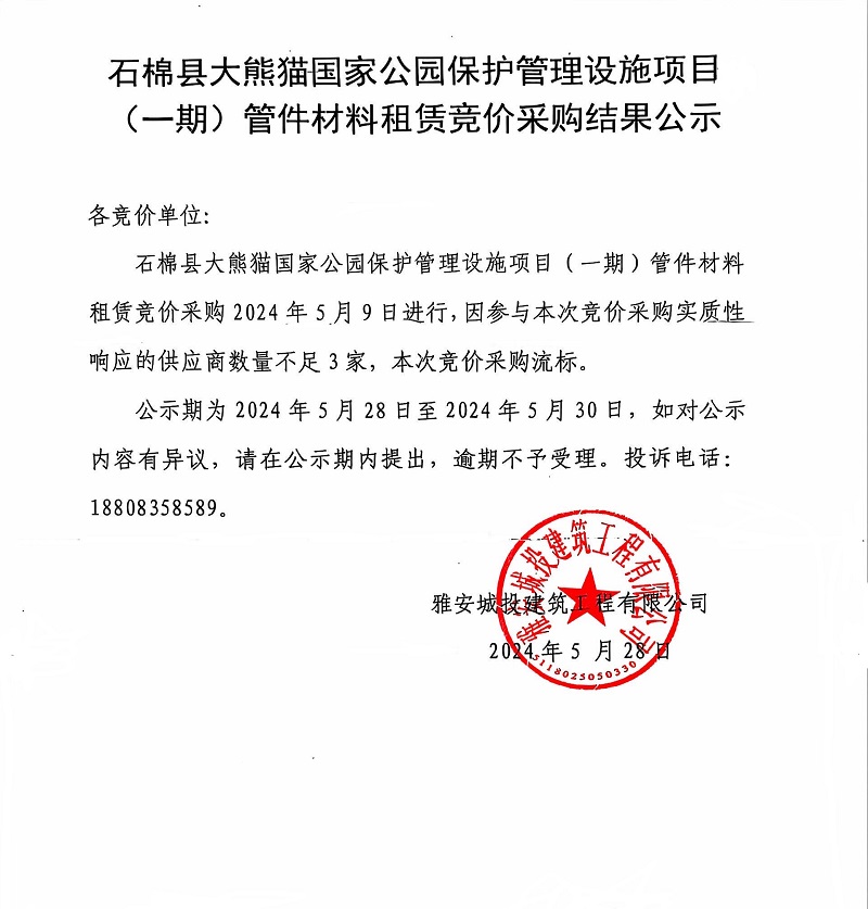 石棉縣大熊貓國家公園保護(hù)管理設(shè)施項目(一期)管件材料租賃競價采購結(jié)果公示
