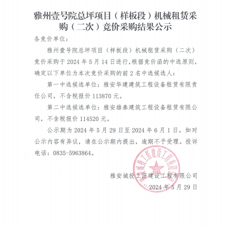 雅州壹號(hào)院總坪項(xiàng)目(樣板段)機(jī)械租賃采購(gòu)(二次)競(jìng)價(jià)采購(gòu)結(jié)果公示