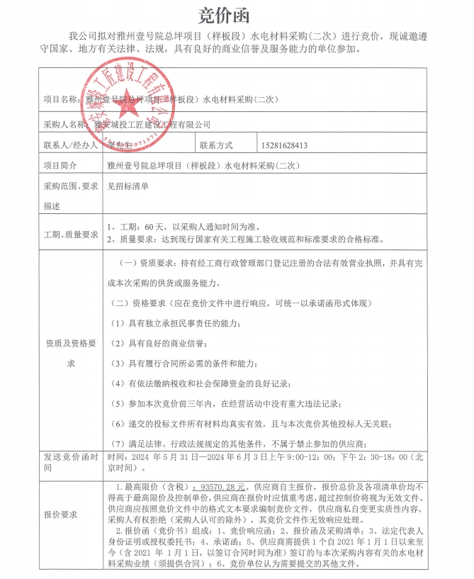 競(jìng)價(jià)函-雅州壹號(hào)院總坪項(xiàng)目(樣板段)水電材料采購