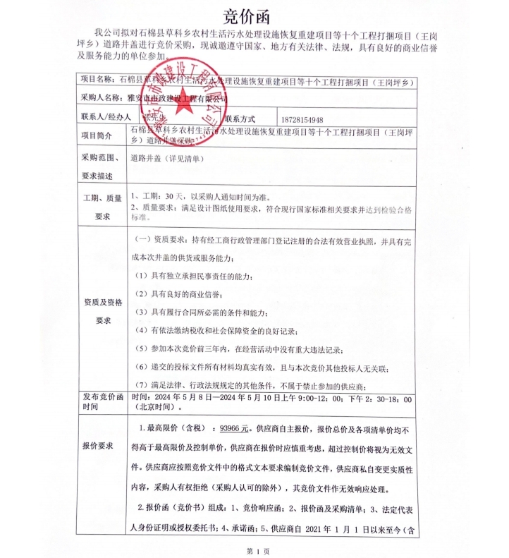 石棉縣草科鄉(xiāng)農(nóng)村生活污水處理設(shè)施恢復(fù)重建項(xiàng)目等十個(gè)工程打捆項(xiàng)目(王崗坪鄉(xiāng))道路井蓋競(jìng)價(jià)公告