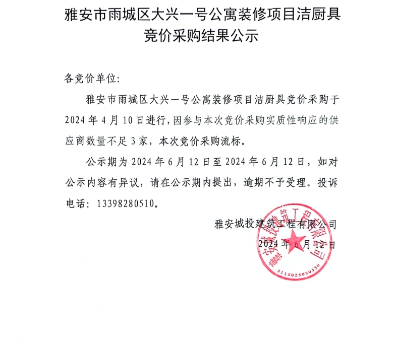 雅安市雨城區(qū)大興壹號公寓裝修項目潔廚具競價采購結(jié)果公示