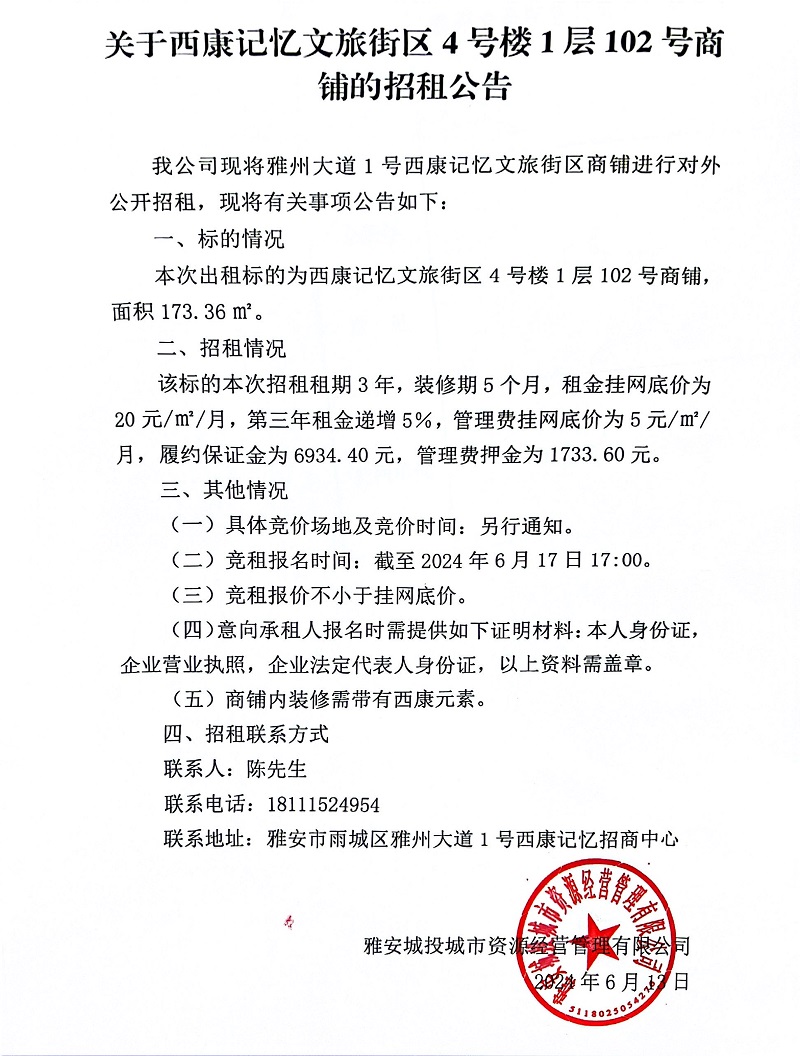 關(guān)于西康記憶文旅街區(qū)4號樓1層102商鋪的招租公告