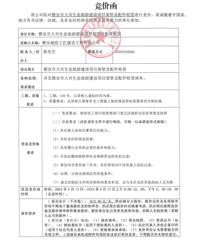 雅安市大興生態(tài)旅游建設(shè)項(xiàng)目架管及配件租賃競(jìng)價(jià)公告