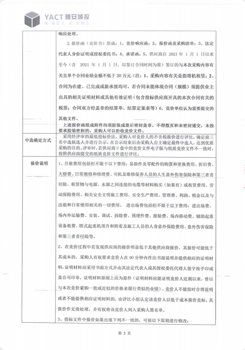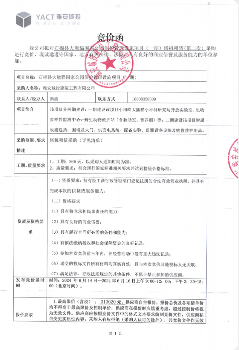 石棉縣大熊貓國家公園保護(hù)管理設(shè)施項(xiàng)目(一期)塔機(jī)租賃(第二次)競價(jià)公告