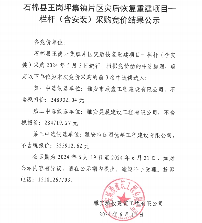 石棉縣王崗坪集鎮(zhèn)片區(qū)災(zāi)后恢復(fù)重建項(xiàng)目--欄桿(含安裝)采購(gòu)競(jìng)價(jià)結(jié)果公示