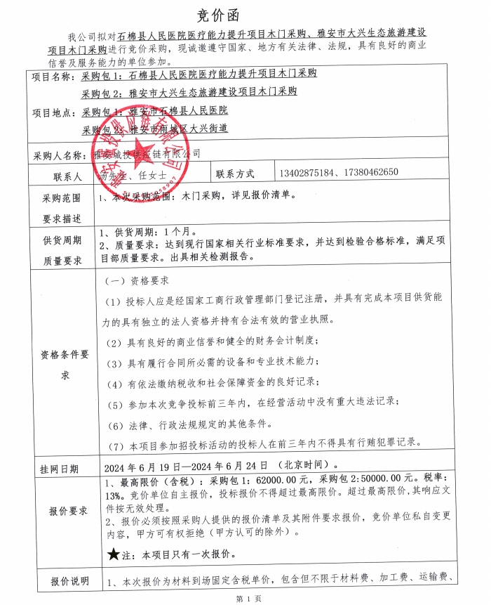 石棉縣人民醫(yī)院醫(yī)療能力提升項(xiàng)目木門采購、雅安市大興生態(tài)旅游建設(shè)項(xiàng)目木門采購競(jìng)價(jià)公告