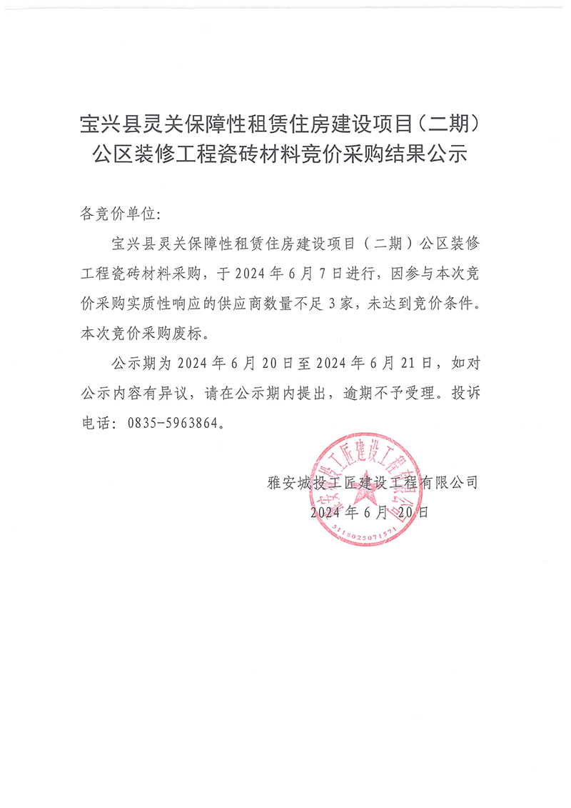 寶興縣靈關保障性租賃住房建設項目(二期)公區(qū)裝修工程瓷磚材料競價采購結(jié)果公示