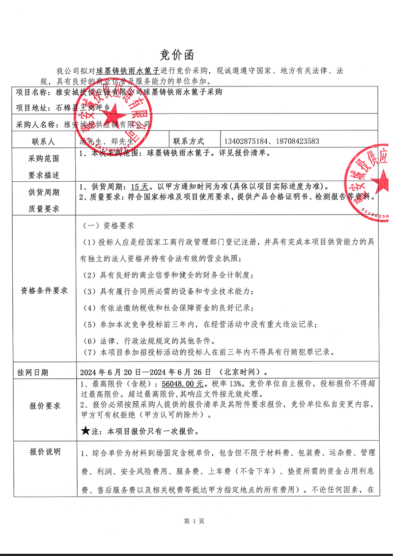 球墨鑄鐵雨水篦子競價(jià)采購函