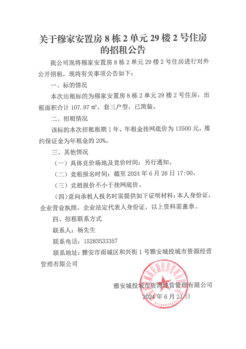 關(guān)于穆家安置房8棟2單元29樓2號住房的招租公告