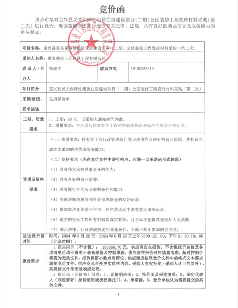 寶興縣靈關(guān)保障性租賃住房建設(shè)項(xiàng)目(二期)公區(qū)裝修工程瓷磚材料采購(第二次)競(jìng)價(jià)公告