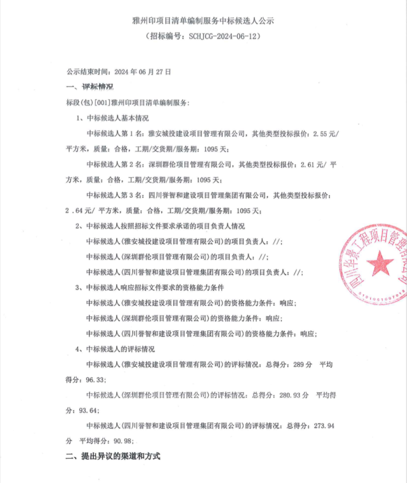雅州印項目清單編制服務(wù)中標候選人公示