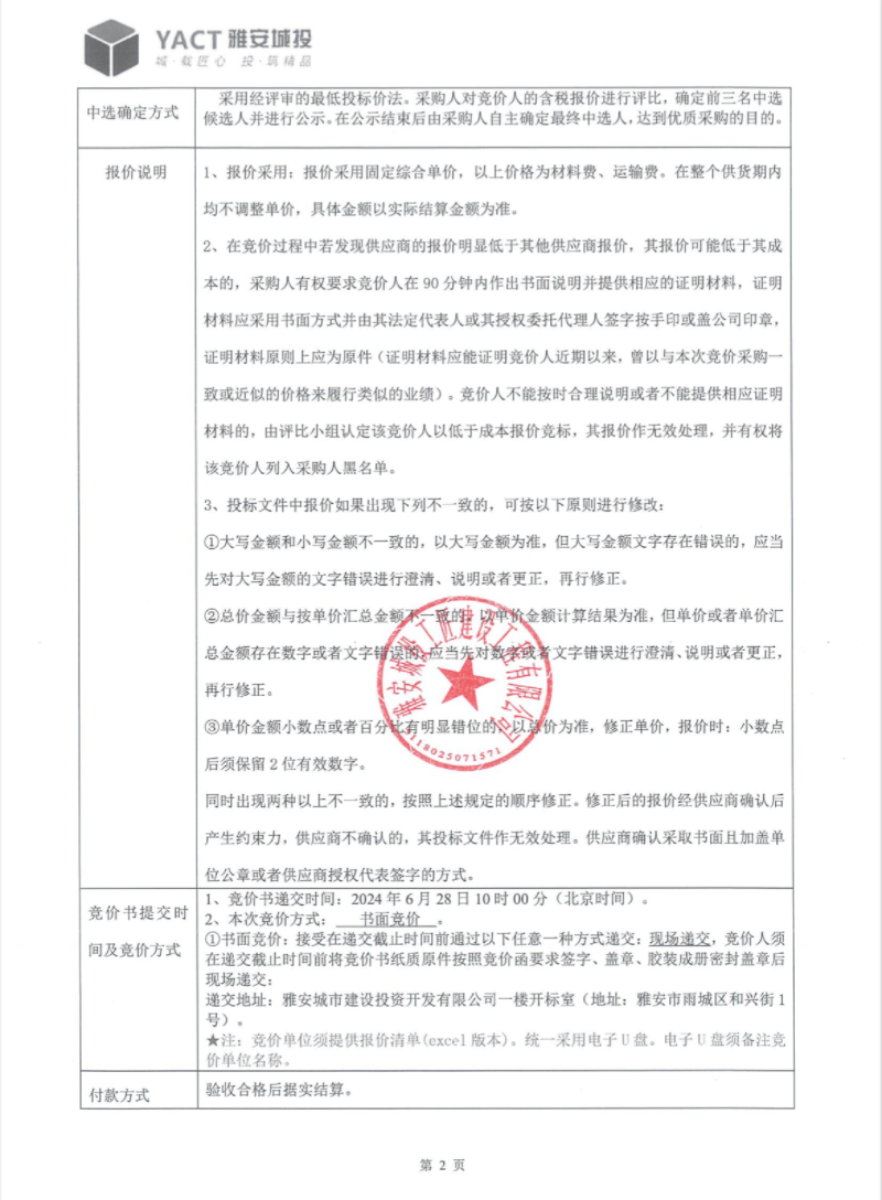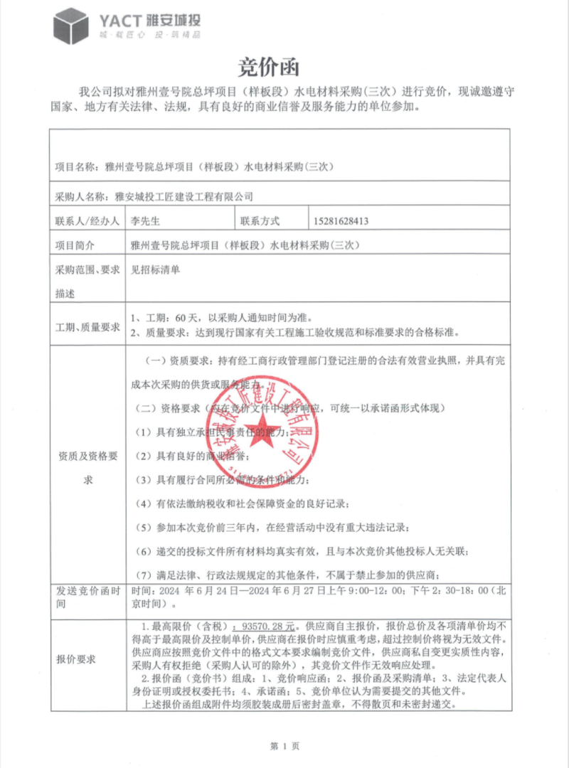 雅州壹號院總坪項目(樣板段)水電材料采購(三次)競價公告
