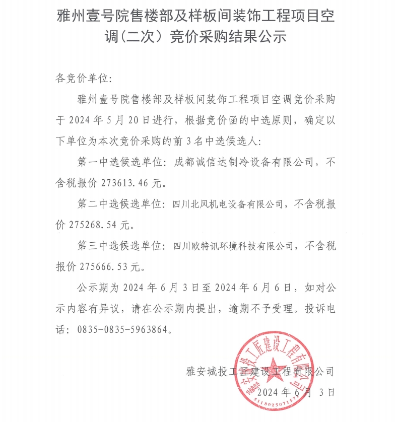 雅州壹號(hào)院售樓部及樣板間裝飾工程項(xiàng)目空調(diào)(二次)競價(jià)采購結(jié)果公示