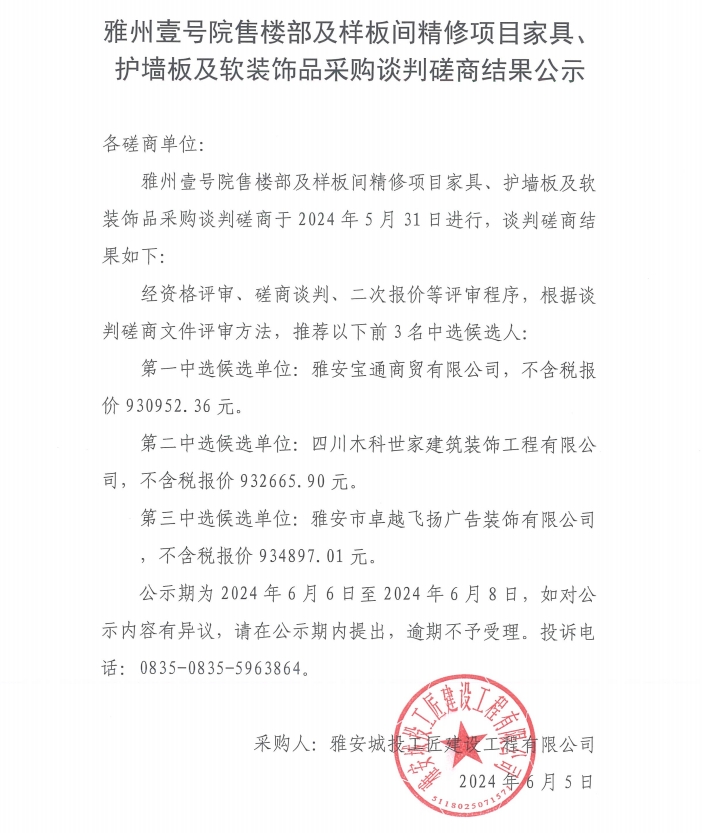 雅州壹號院售樓部及樣板間精修項目家具、護(hù)墻板及軟裝飾品采購談判磋商結(jié)果公示