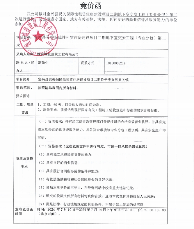 寶興縣靈關(guān)保障性租賃住房建設(shè)項(xiàng)目二期地下室交安工程(專業(yè)分包)第二次競價(jià)公告