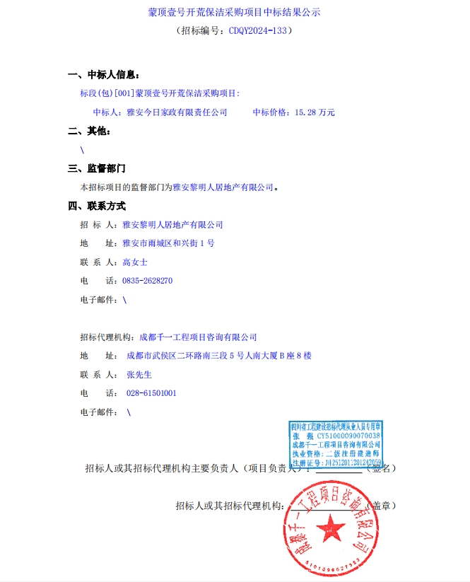 蒙頂壹號(hào)開荒保潔采購(gòu)項(xiàng)目中標(biāo)結(jié)果公示