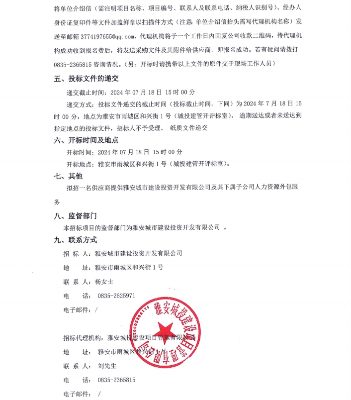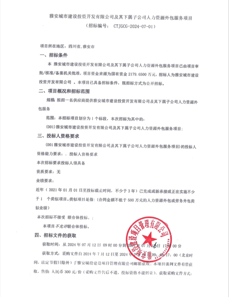 雅安城市建設(shè)投資開發(fā)有限公司及其下屬子公司人力資源外包服務(wù)項目公告