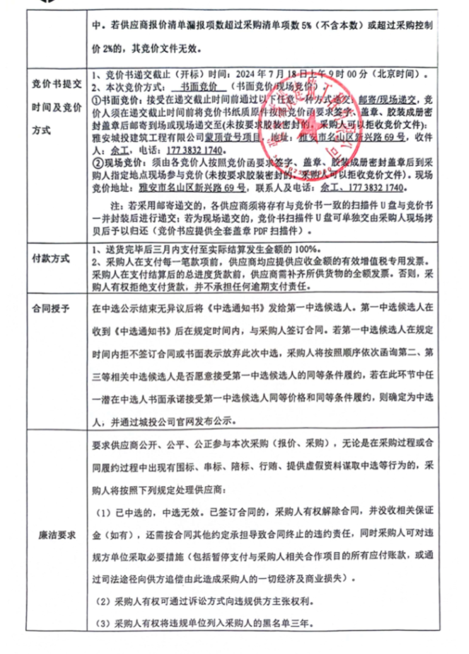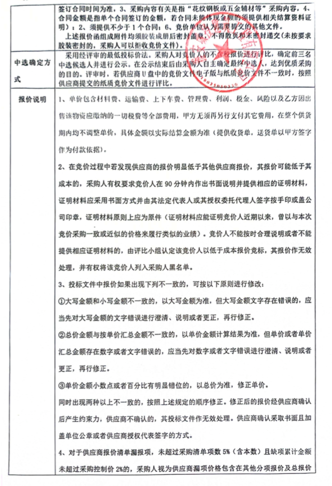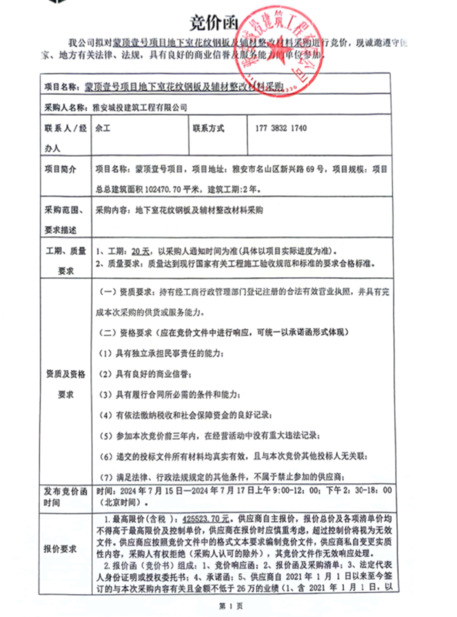 蒙頂壹號項目地下室花紋鋼板及輔材整改材料采購競價公告