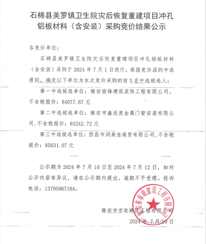 石棉美羅鎮(zhèn)衛(wèi)生院災后恢復重建項目沖孔鋁板材料(含安裝)采購競價結(jié)果公示