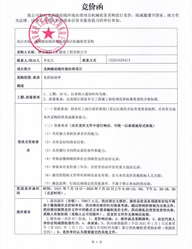 龍洲路沿線環(huán)境治理項(xiàng)目機(jī)械租賃采購競價(jià)公告