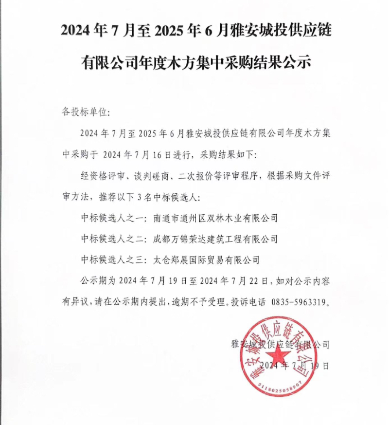 2024年7月至2025年6月雅安城投供應(yīng)鏈有限公司年度木方集中采購結(jié)果公示