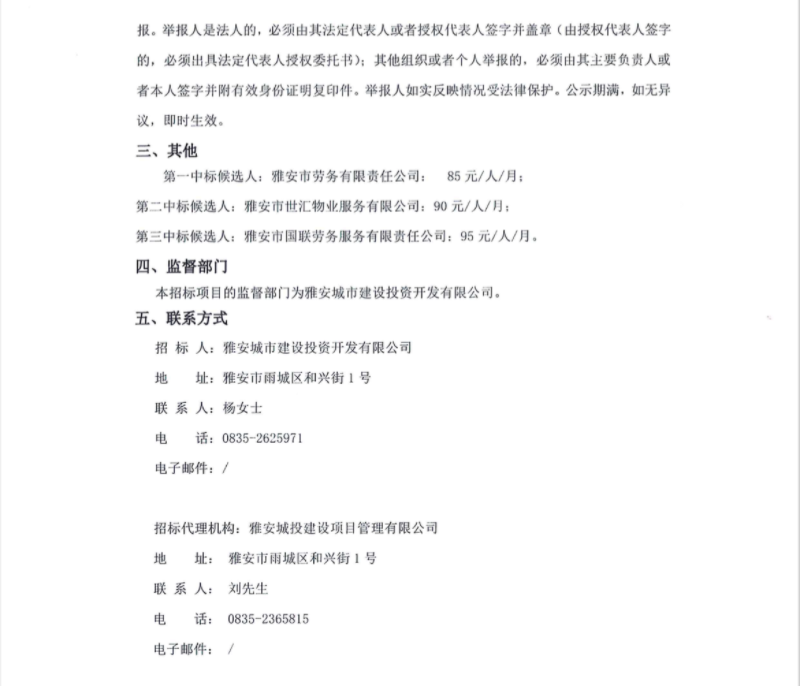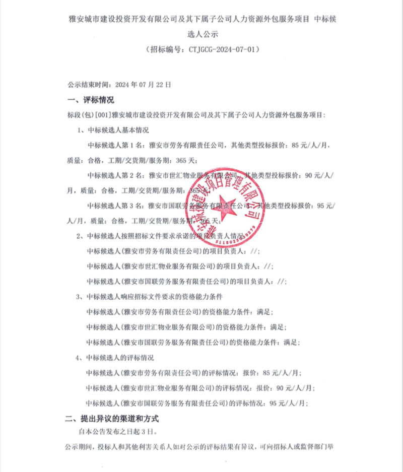雅安城市建設(shè)投資開發(fā)有限公司及其下屬子公司人力資源外包服務(wù)項(xiàng)目中標(biāo)候選人公示