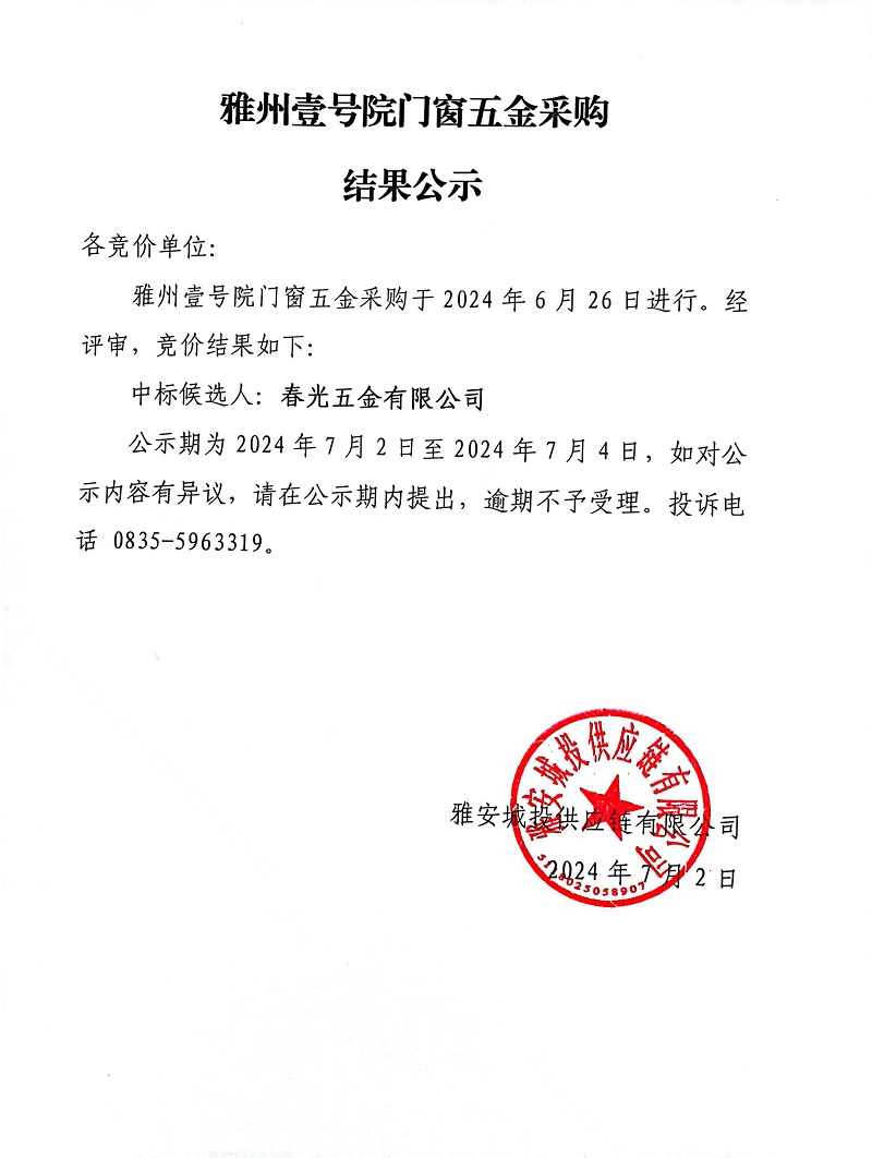 雅州壹號院門窗五金采購結(jié)果公示