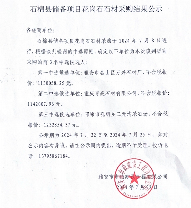 石棉縣儲(chǔ)備項(xiàng)目花崗石石材采購(gòu)結(jié)果公示