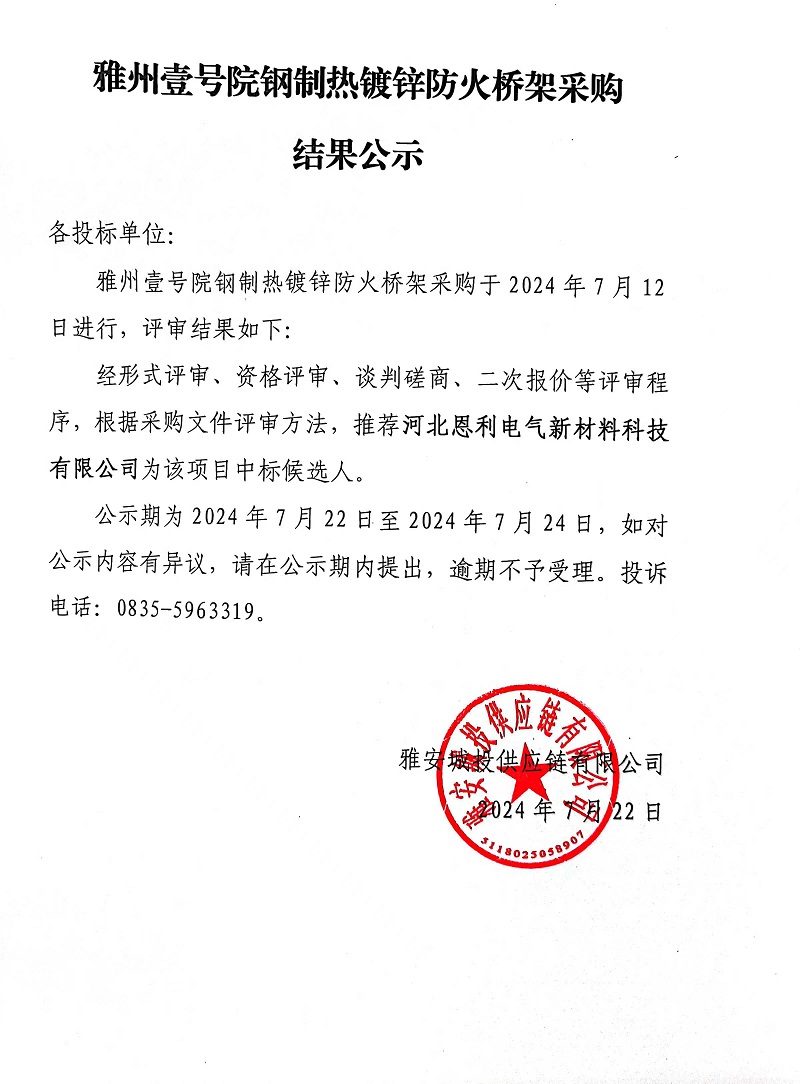 雅州壹號院鋼制熱鍍鋅防火橋架采購結果公示
