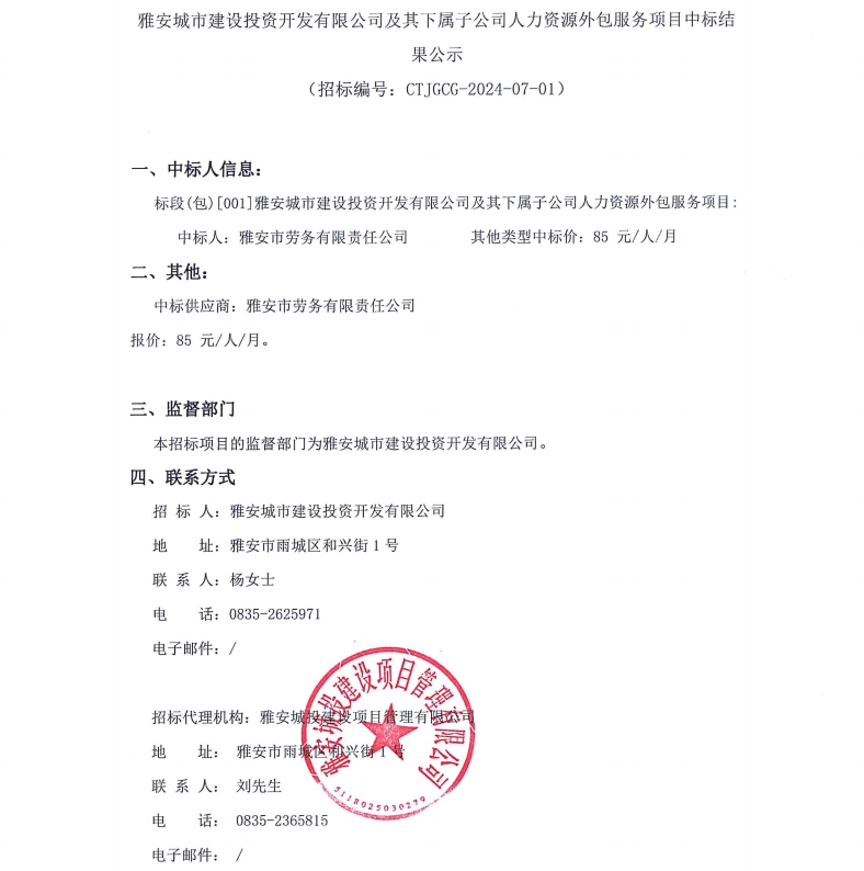 雅安城市建設(shè)投資開發(fā)有限公司及其下屬子公司人力資源外包服務(wù)項(xiàng)目中標(biāo)結(jié)果公示