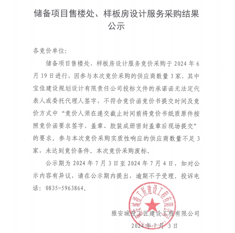 儲備項(xiàng)目售樓處、樣板房設(shè)計(jì)服務(wù)采購結(jié)果公示