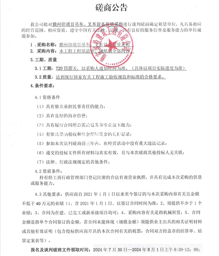 雅州印項(xiàng)目吊車、叉車設(shè)備租賃采購談判磋商公告