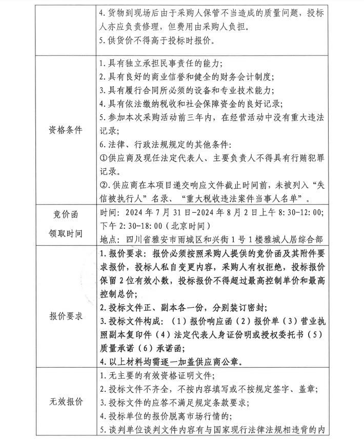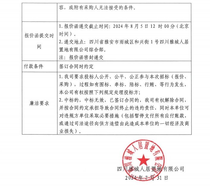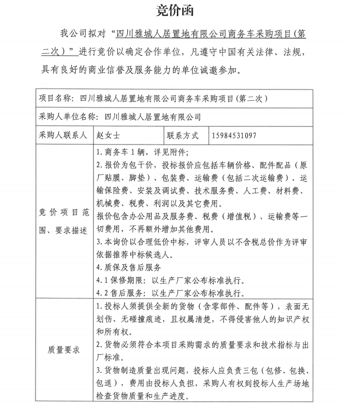四川雅城人居置地有限公司商務(wù)車采購項目(第二次)競價公告