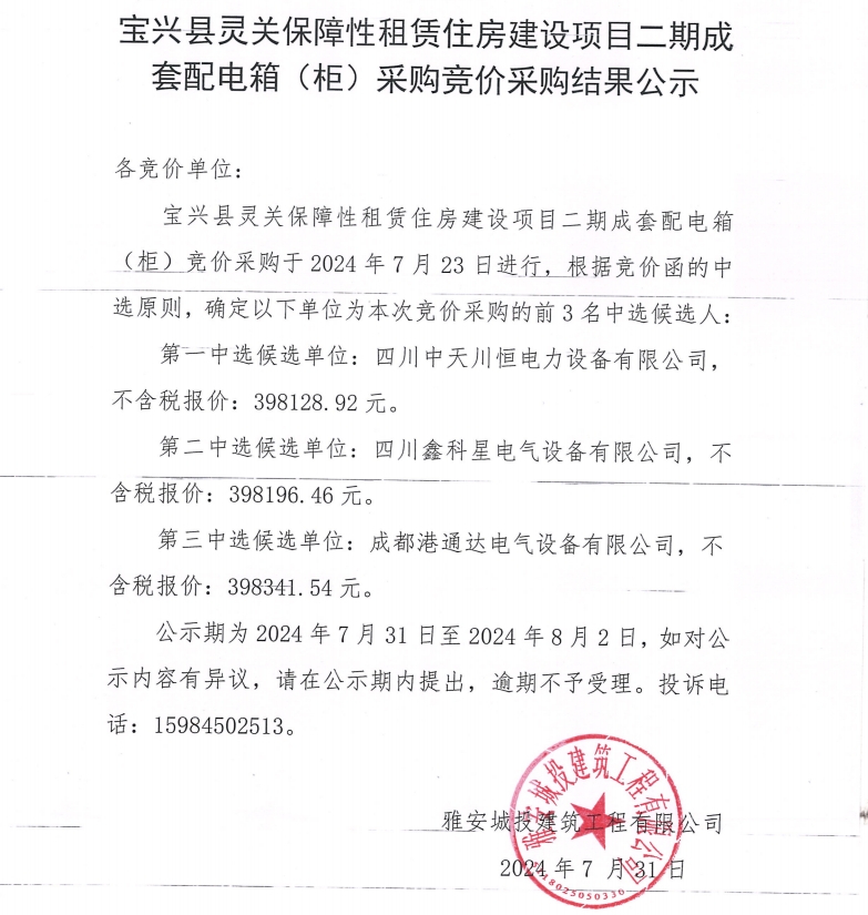 寶興縣靈關(guān)保障性租賃住房建設項目二期成套配電箱(柜)采購競價采購結(jié)果過公示