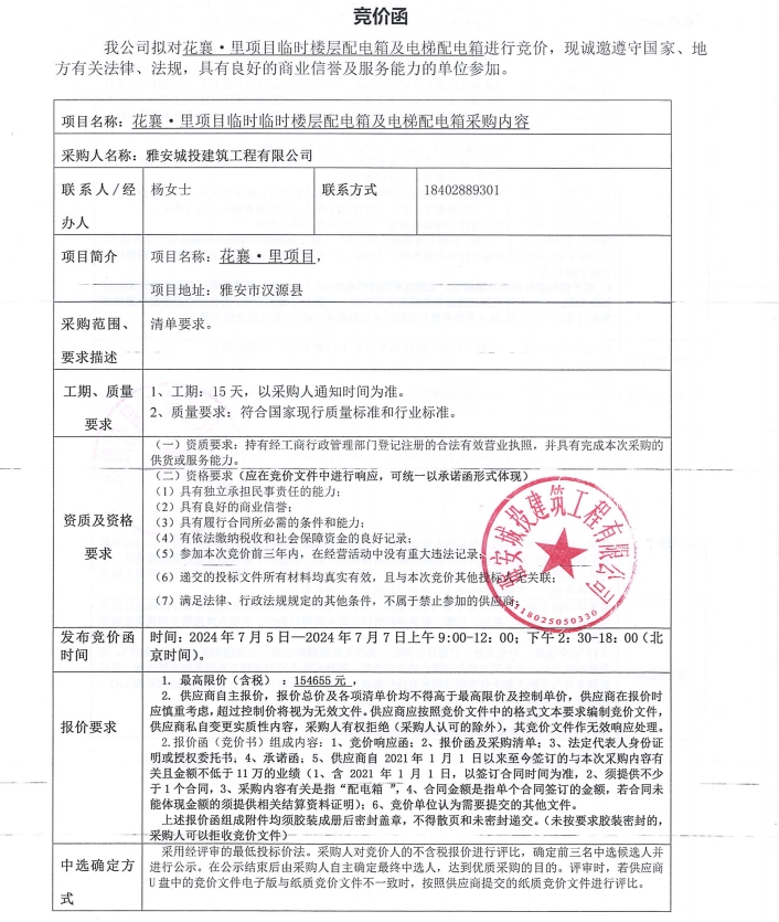 花襄·里項目臨時樓層配電箱及電梯配電箱競價公告