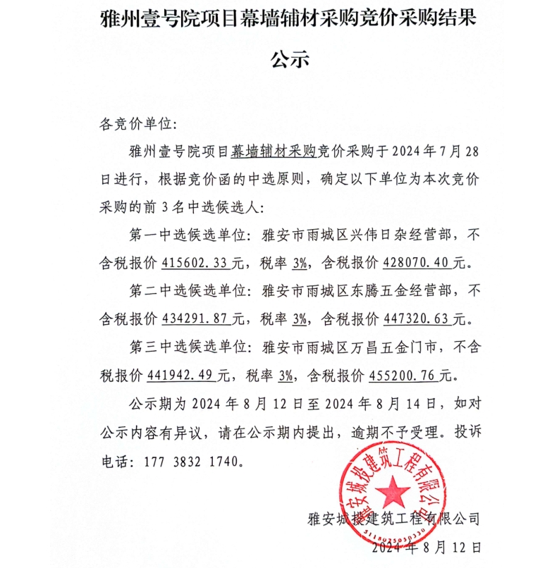 雅州壹號院項目幕墻輔材采購競價采購結(jié)果公示