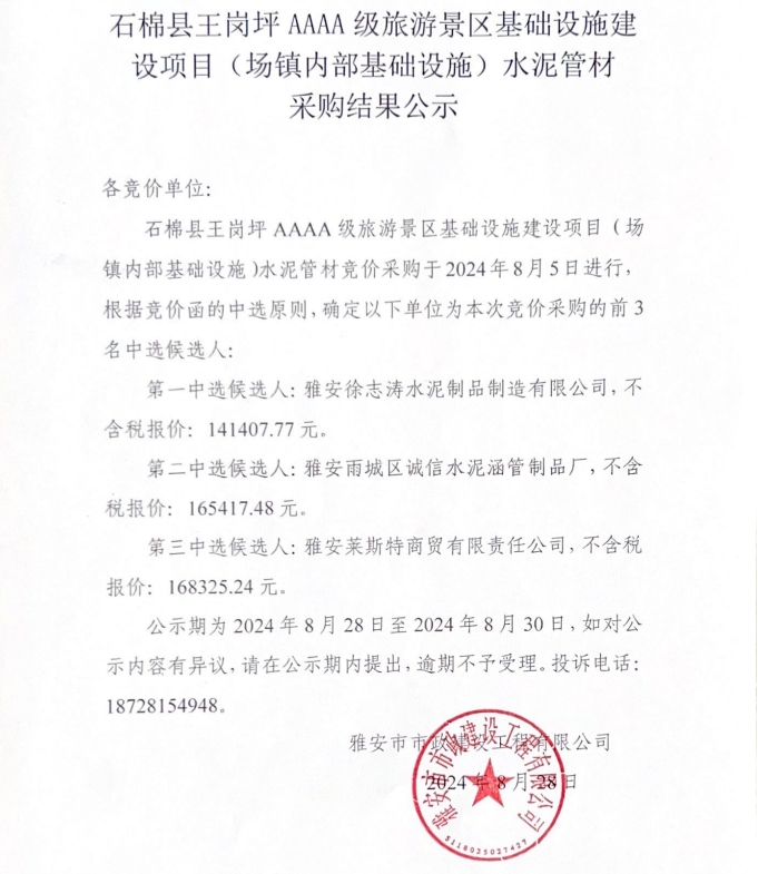 石棉縣王崗坪AAAA級旅游景區(qū)基礎設施建設項目(場鎮(zhèn)內部基礎設施)水泥管材采購結果公示