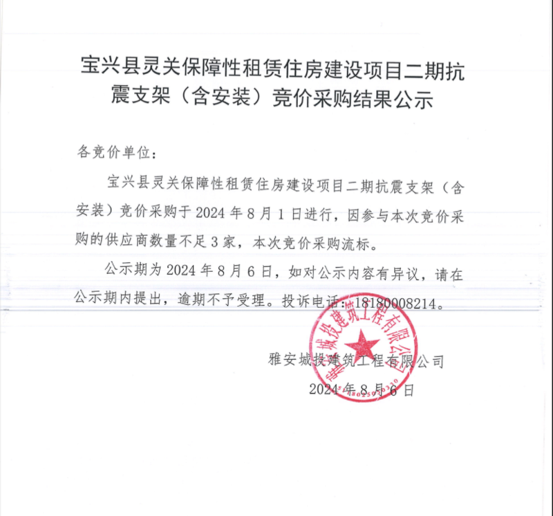 寶興縣靈關保障性租賃住房建設項目二期抗震支架(含安裝)競價采購結果公示