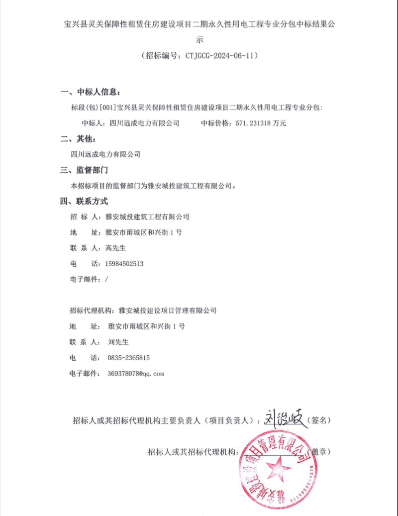 寶興縣靈關(guān)保障性租賃住房建設(shè)項目二期永久性用電工程專業(yè)分包中標結(jié)果公示
